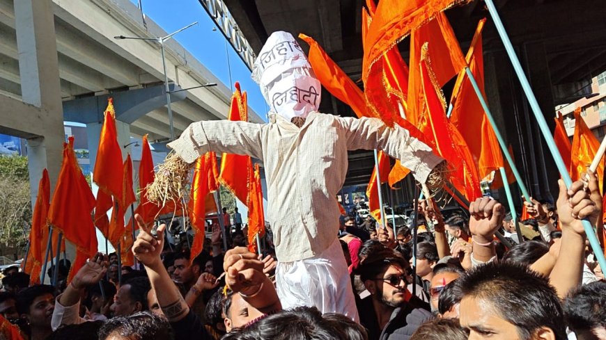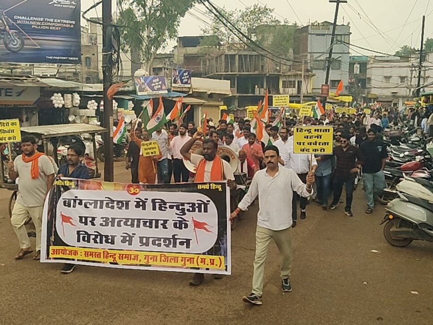 बांग्लादेश में हिंदुओं पर हो रहे अत्याचार के खिलाफ भोपाल में प्रदर्शन करते हिंदू संगठन के कार्यकर्ता।