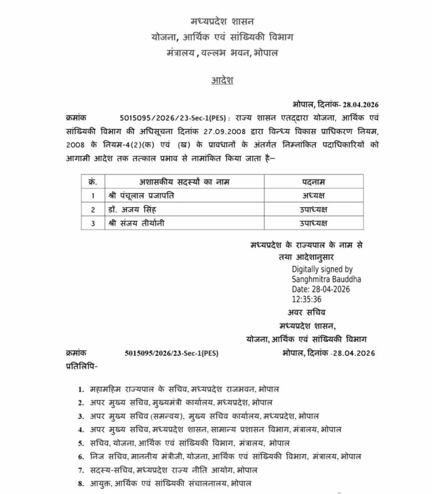 मध्यप्रदेश सरकार ने विंध्य विकास प्राधिकरण में अध्यक्ष और दो उपाध्यक्षों को नामांकित किया है। सरकार ने पिछले चार दिनों से रोज एक-दो निगम, मंडल, विकास प्राधिकरण और आयोग में अध्यक्ष, उपाध्यक्ष, सदस्य की नियुक्ति का सिलसिला जारी रखा है। अभी यह प्रक्रिया जारी रहने की उम्मीद है। दरअसल, राज्यपाल के आदेश से मध्यप्रदेश में योजना, आर्थिक और सांख्यिकी विभाग से अवर सचिव संघमित्र बुद्धा ने यह आदेश जारी किया है। जिसमें पूर्व विधायक पंचूलाल प्रजापति को विंध्य विकास प्राधिकरण का अध्यक्ष नियुक्त किया है। वहीं डॉ. अजय सिंह और संजय तीथार्नी को उपाध्यक्ष मनोनित किया है। यह मप्र राजनीतिक नियुक्तियां है। गौरतलब है कि पंचूलाल रीवा जिले की मनगवां विधानसभा सीट से विधायक रहे हैं। 2018 में पहली बार भाजपा के टिकट पर विधायक बने थे।