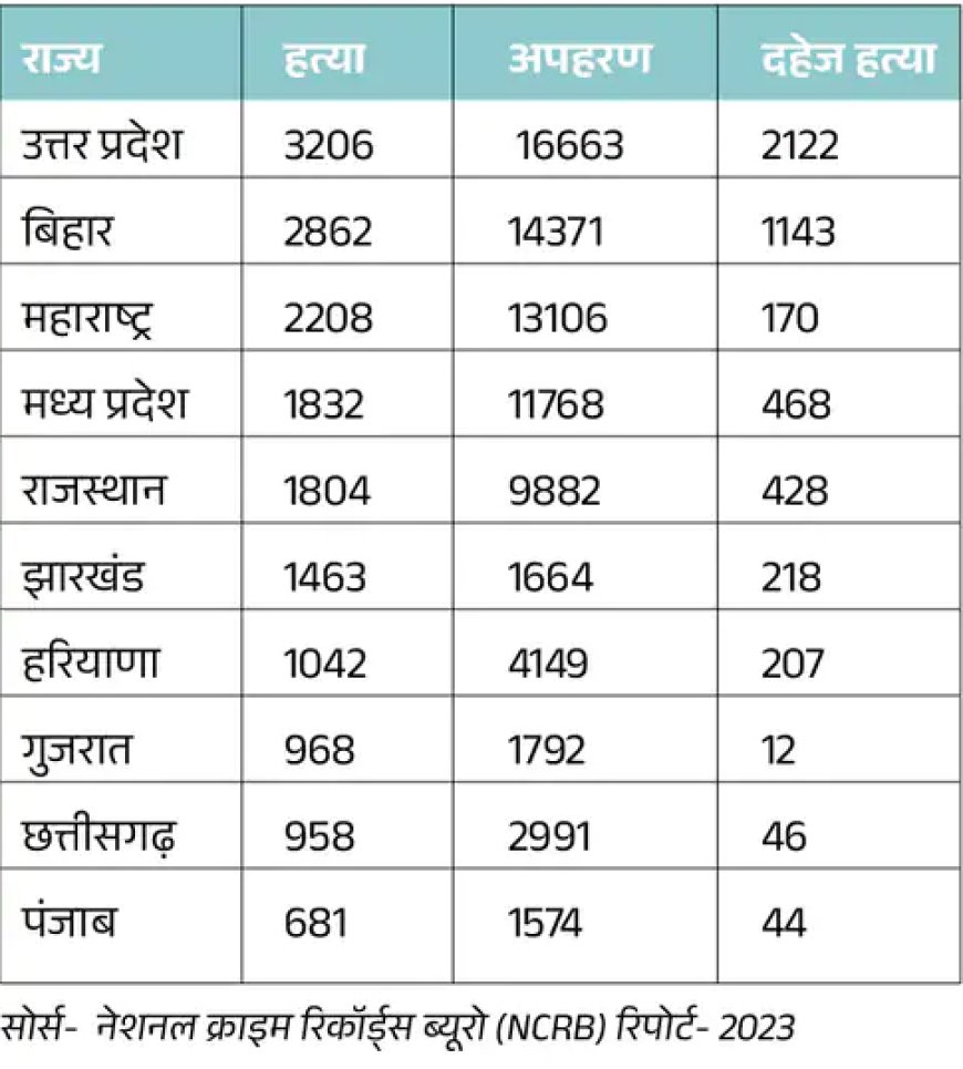 राज्यों में हत्या और अपहरण के केसो में उत्तर प्रदेश और बिहार शीर्ष पर हैं। यानी गंभीर अपराधों की संख्या अन्य राज्यों की तुलना में इन दोनों राज्यों में सबसे अधिक है। इसके अलावा, सड़क दुर्घटनाओं के मामलों में भी यूपी टॉप पर है, जो राज्य में बढ़ती ट्रैफिक और सुरक्षा व्यवस्था की चिंताओं को दर्शाता है।