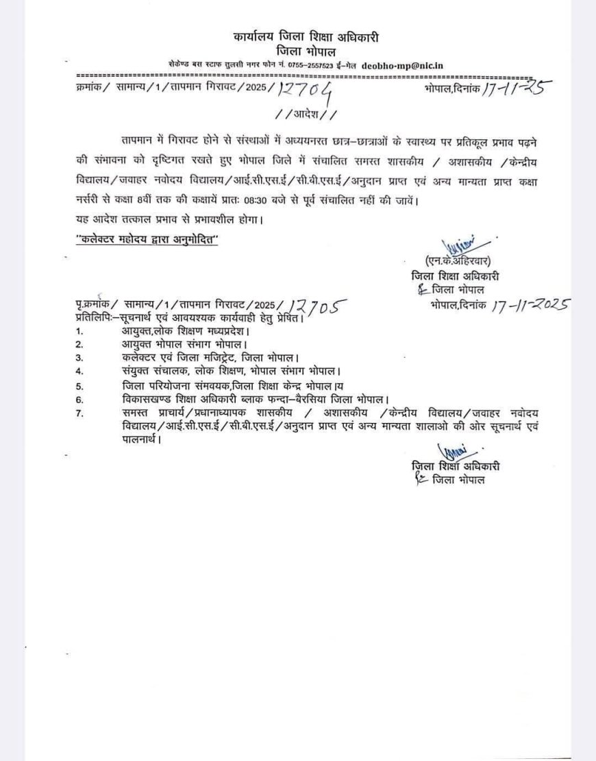 भोपाल में कड़ाके की ठंड के चलते स्कूलोंं का टाइम बदल दिया गया है। स्कूलों की टाइमिंग को लेकर भोपाल जिला शिक्षा अधिकारी ने आदेश जारी कर दिए गए हैं। सभी स्कूलों में नर्सरी से लेकर आठवीं तक की कक्षा सुबह 8:30 बजे से पहले नहीं लगाने के निर्देश दिए गए हैं।