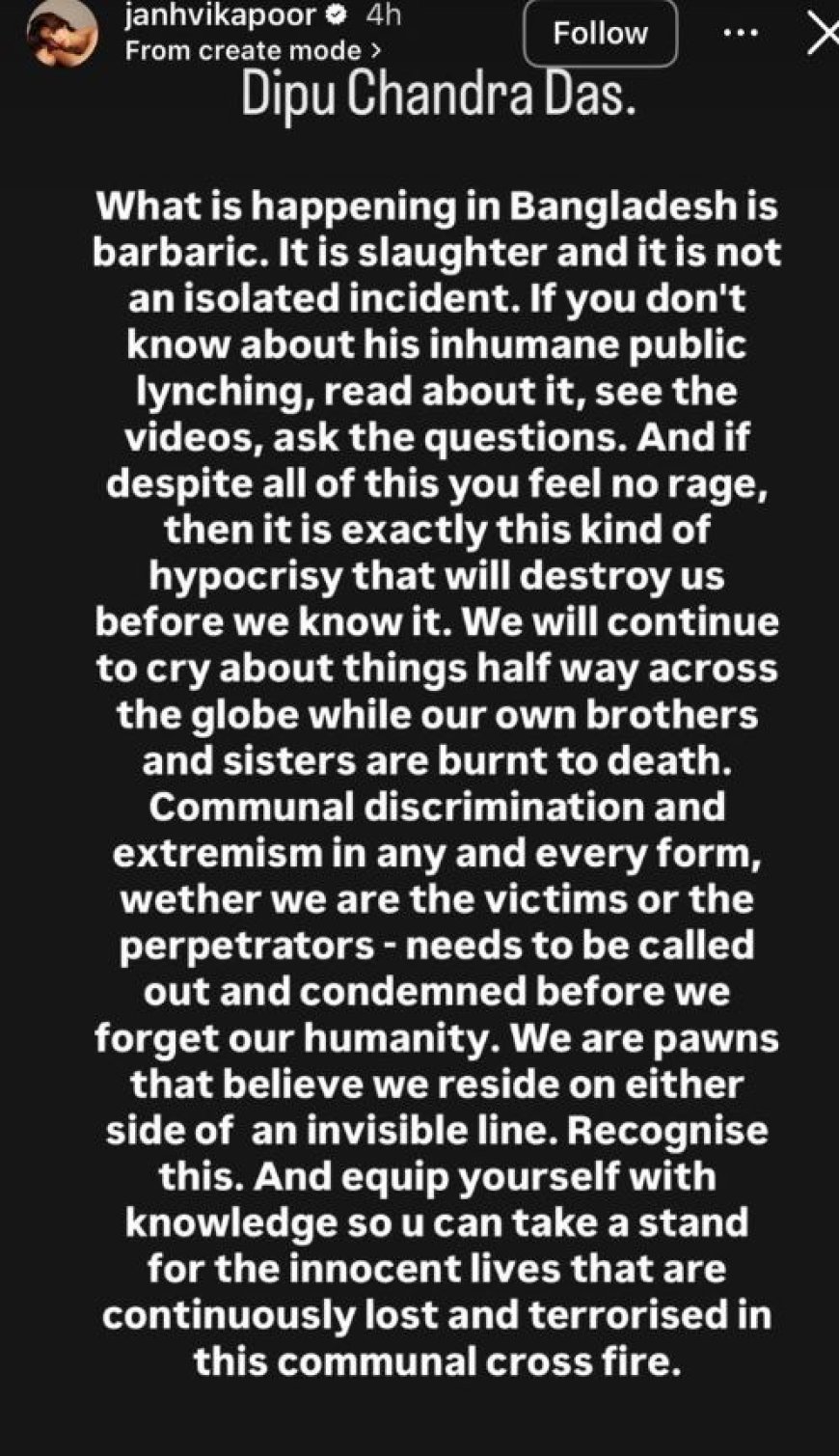 हाल ही में बांग्लादेश में दीपू चंद्र दास को जिंदा जला दिया गया था। इस बर्बरता ने हर किसी को हिला दिया। अब अभिनेत्री जाह्नवी कपूर ने बांग्लादेश लिंचिंग पर रिएक्शन दिया है। जाह्नवी कपूर ने इंस्टाग्राम स्टोरी पर एक लंबा चौड़ा नोट लिखकर बांग्लादेश में हुई दर्दनाक घटनाक पर गुस्सा जाहिर किया है। इस घटना ने एक्ट्रेस को अंदर तक हिला दिया है। उन्होंने सवाल उठाया है। जाह्नवी कपूर ने इंस्टाग्राम स्टोरी में लिखा-बांग्लादेश में जो हो रहा है, वह बर्बर है। यह नरसंहार है और यह कोई अकेली घटना नहीं है।