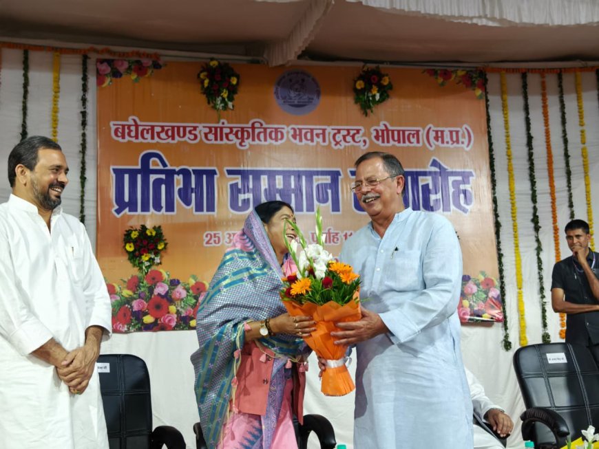विंध्य को गौरवान्वित करने वाली प्रतिभाओं का सम्मान भोपाल में किया गया। विभिन्न प्रतियोगी परीक्षाओं में परचम लहराने वाले विंध्य के निवासियों के सम्मान के लिए प्रतिवषार्नुसार इस वर्ष भी बघेलखंड सांस्कृतिक भवन ट्रस्ट भोपाल के तत्वावधान में भव्य प्रतिभा सम्मान समारोह शनिवार को आयोजित किया गया। जहां राजधानी भोपाल के बघेलखंड भवन में बघेलखंड सांस्कृतिक भवन ट्रस्ट भोपाल द्वारा आयोजित प्रतिभा सम्मान समारोह में पहुंचे विधानसभा अध्यक्ष नरेंद्र सिंह तोमर और राज्य मंत्री राधा सिंह का मप्र विधानसभा के पूर्व नेता प्रतिपक्ष अजय सिंह ने पुष्पगुच्छ भेंट कर स्वागत किया। इसके साथ ही सम्मान समारोह का विधिवत शुभारंभ किया गया।