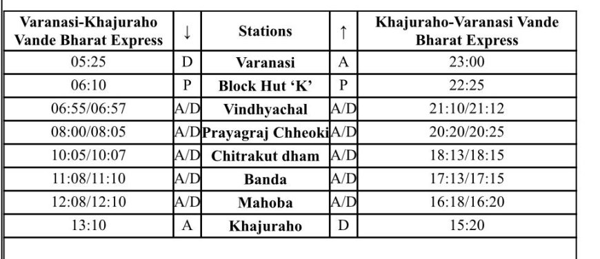 खजुराहो से वाराणसी: यह ट्रेन दोपहर 3:20 बजे खजुराहो से रवाना होगी और महोबा, बांदा, प्रयागराज छिवकी और विंध्याचल होते हुए रात 11:00 बजे वाराणसी पहुंचेगी।