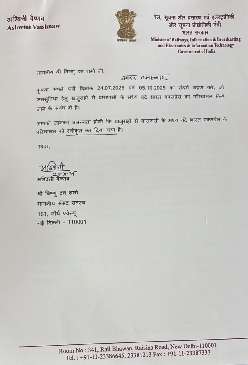 प्रधानमंत्री नरेंद्र मोदी ने खजुराहो-वाराणसी वंदे भारत एक्सप्रेस के संचालन को हरी झंडी देकर बुंदेलखंड क्षेत्र को एक महत्वपूर्ण सौगात दी है। यह निर्णय खजुराहो लोकसभा सांसद डॉ. विष्णु दत्त शर्मा के निरंतर प्रयासों का परिणाम है।