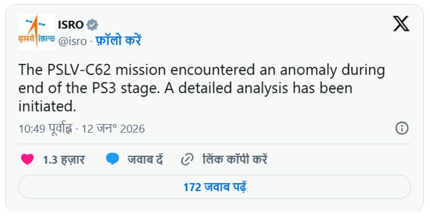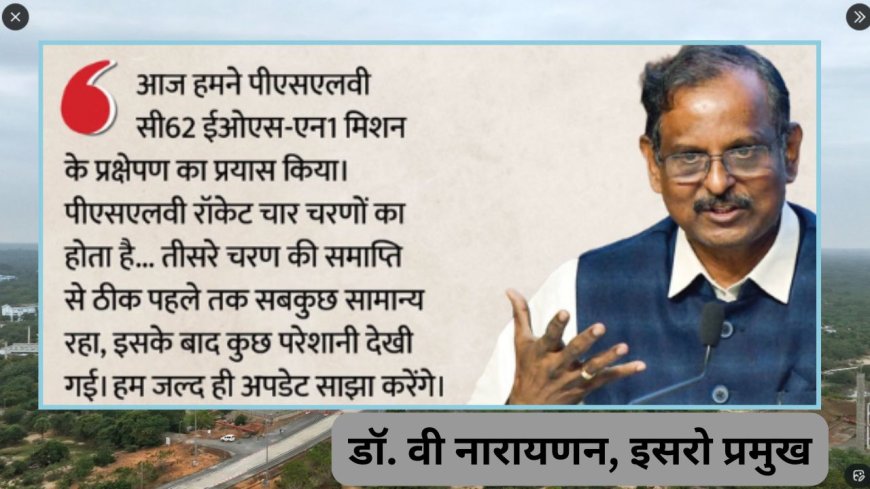 इसरो ने आधिकारिक बयान जारी कर बताया कि PSLV-C62 मिशन के तीसरे चरण (PS3) के समापन के दौरान एक 'एनोमली' (गड़बड़ी) देखी गई है। इसरो प्रमुख डॉ. वी नारायणन ने स्थिति स्पष्ट करते हुए कहा, "पीएसएलवी एक चार चरणों वाला रॉकेट है। तीसरे चरण के समाप्त होने तक सब कुछ सामान्य था, लेकिन उसके ठीक बाद तकनीकी दिक्कत आई। हमारी टीम विस्तृत जांच कर रही है और जल्द ही अपडेट साझा किया जाएगा।"