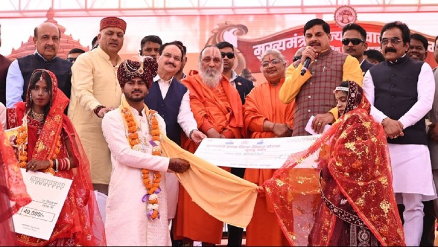बंगाल पर राजनीतिक चर्चा के बाद जेपी नड्डा, मुख्यमंत्री डॉ. मोहन यादव और कैबिनेट मंत्री राकेश सिंह के साथ एक भव्य सामूहिक विवाह सम्मेलन में शामिल हुए। इस सम्मेलन में कुल 121 जोड़ों का विवाह संपन्न हुआ, जिनमें 3 मुस्लिम जोड़े भी शामिल थे। इस आयोजन का लाभ उन जोड़ों को मिला जिनकी शादी पहले से तय थी या जिन्होंने प्रेम विवाह किया था, लेकिन आर्थिक रूप से सहायता की आवश्यकता थी। विवाह बंधन में बंधे जोड़ों, विशेषकर नंदिनी अहिरवार और उनके पति ने शासन की इस पहल की सराहना की और इसे अपने जीवन का सबसे यादगार पल बताया।