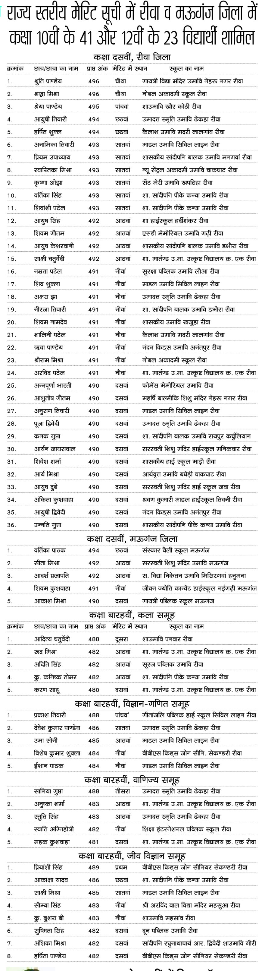 बुधवार को जाी बोर्ड परीक्षा परिणाम में बेटियों ने बाजी मार ली। प्रदेश की प्रवीण्य सूची में रीवा और मऊगंज जिला में बेटियों का ही जलवा रहा। 64 छात्र-छात्राएं मैरिट में जगह बनाने में सफल रहे। इनमें से 38 टॉपर बेटियां ही थी। परीक्षा परिणाम जारी होने के बाद स्कूलों में टॉप करने वाले छात्रों को सम्मान किया गया। मुंह मिठा कराया गया। उनके उज्जवल भविष्य को लेकर गुरुजनों ने आशीर्वाद दिया।