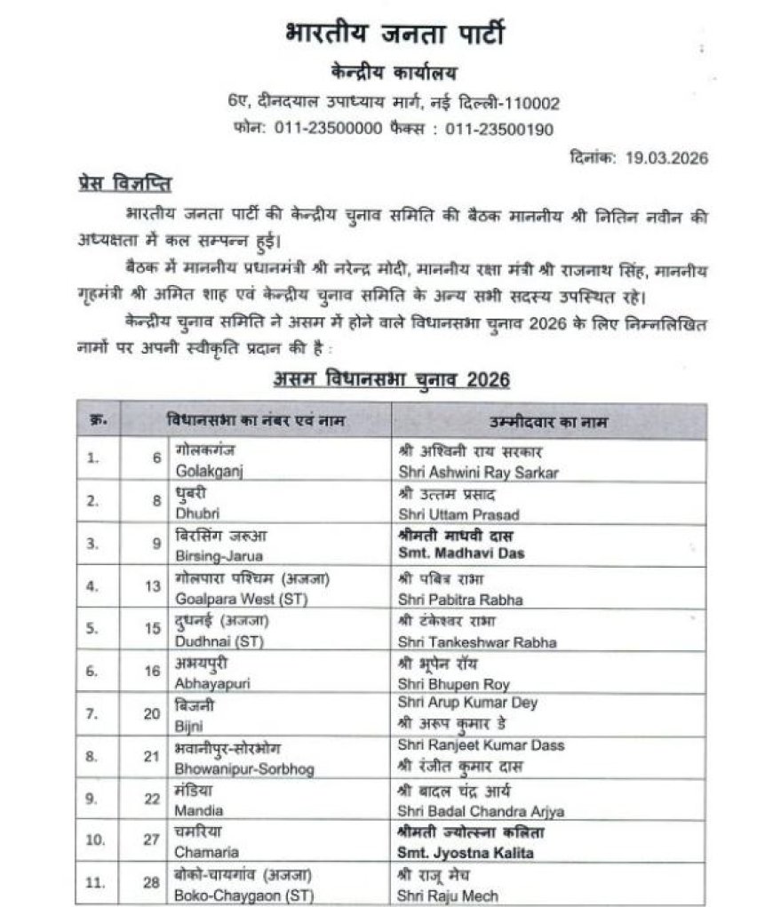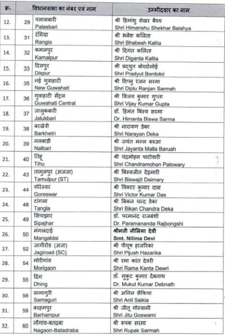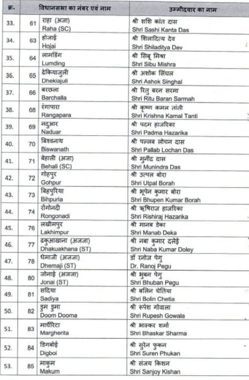 उधर 25 दिन पहले भाजपा में आए पूर्व कांग्रेस अध्यक्ष भूपेन बोरा को भी टिकट दिया गया है। असम में 126 सीटें हैं। भाजपा 126 विधानसभा सीटों में से 89 पर चुनाव लड़ेगी। बाकी 37 में से असम गण परिषद (एजीपी) 26 सीटों पर, बोडोलैंड पीपुल्स फ्रंट (बीपीएफ) 11 सीटों पर चुनाव लड़ेगी।
