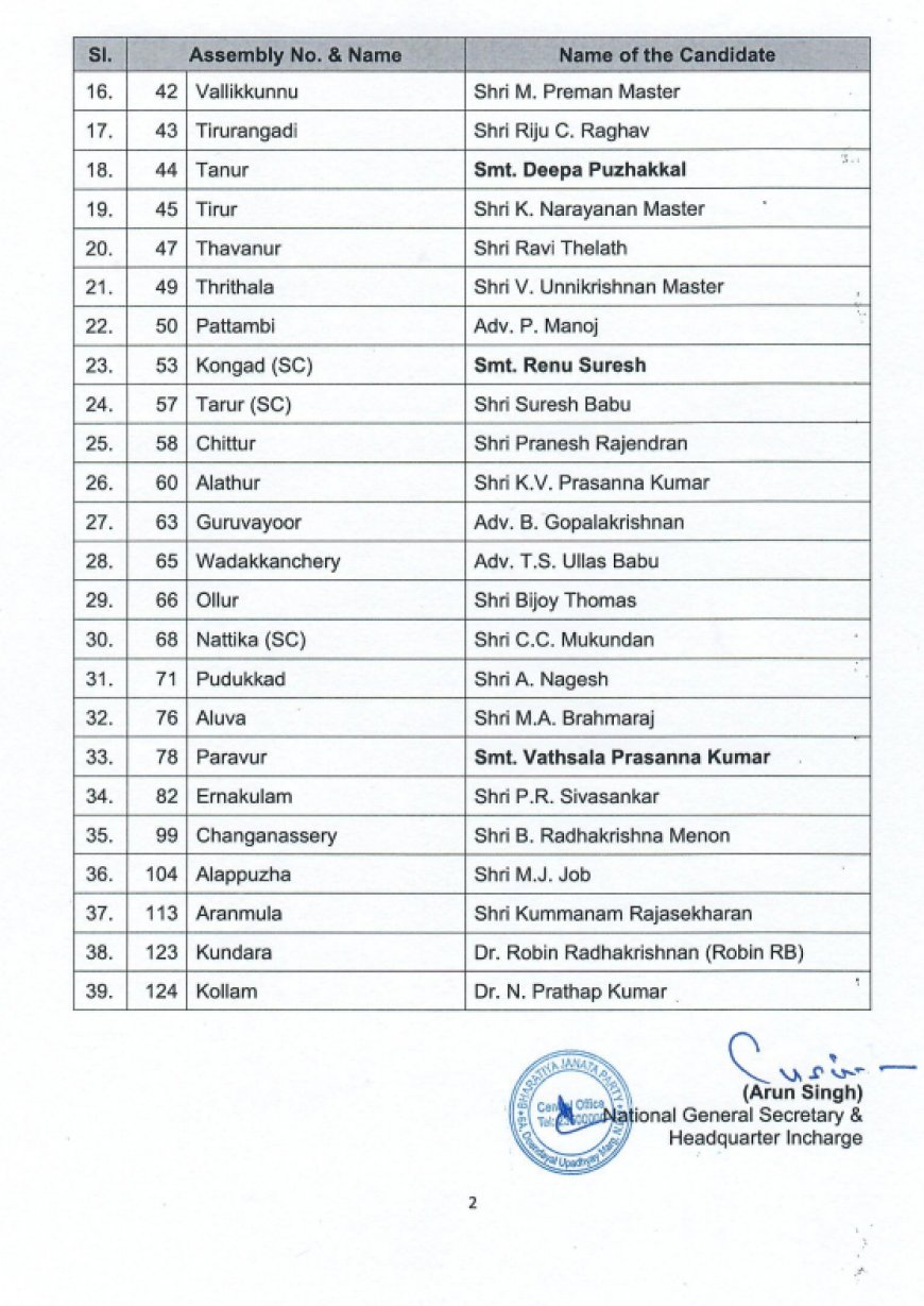 केरल की भाजपा ने दूसरी लिस्ट जारी