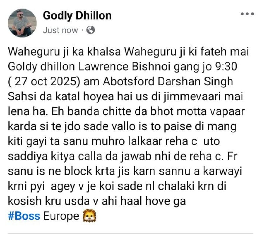 कुख्यात गैंगस्टर लॉरेंस बिश्नोई के गैंग ने कनाडा के एबॉट्सफोर्ड स्थित एक भारतीय मूल के उद्योगपति की हत्या और एक पंजाबी गायक के घर पर गोलीबारी की जिम्मेदारी ली है। गिरोह का दावा है कि साहसी एक बड़े ड्रग कारोबार से जुड़ा था और उसने उससे पैसे मांगे थे। पैसे न मिलने पर गैंग ने उसकी हत्या कर दी।