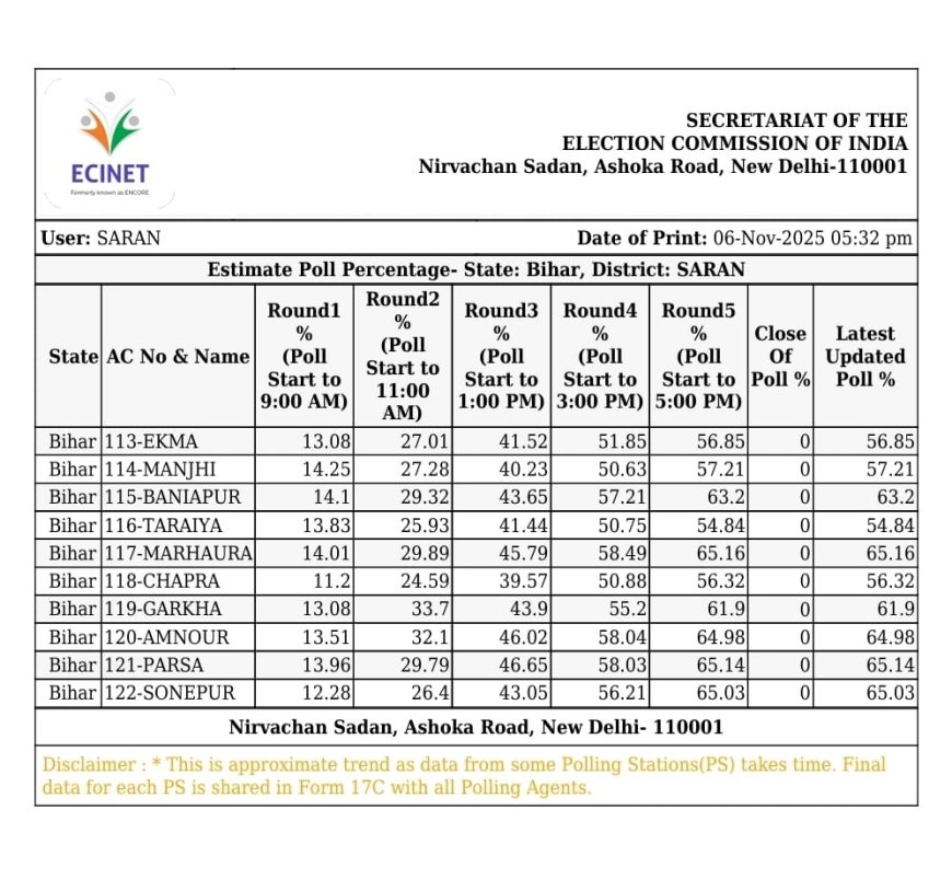 'बिहार चुनाव संग्राम' में आज यानी गुरूवार का दिन मतदाताओं का दिन था। पहले चरण में 18 जिलों की 121 विधानसभा सीटों पर मतदान के साथ ही कई सियासी दिग्गजों की किस्मत ईवीएम में बंद हो गई। तेजस्वी यादव, तेज प्रताप यादव, अनंत सिंह, मैथिली ठाकुर और उप मुख्यमंत्री सम्राट चौधरी, डिप्टी सीएम विजय सिन्हा के साथ नीतीश सरकार के 16 मंत्रियों की किस्मत मतदाताओं ने तय कर दी है। शाम पांच बजे तक 70% से ज्यादा होने का आंकड़ा सामने आया है। उपमुख्यमंत्री विजय कुमार सिन्हा के काफिले पर पथराव हुआ।