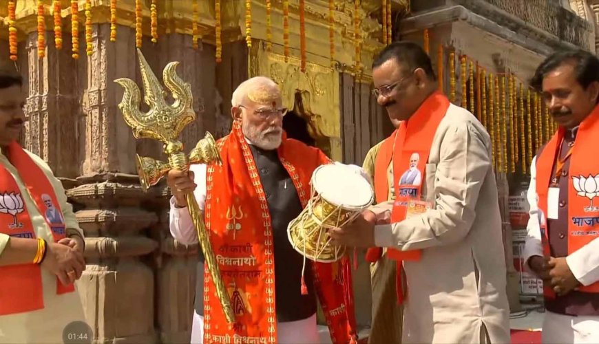 प्रधानमंत्री नरेंद्र मोदी दो दिवसीय वाराणसी दौरे के दूसरे दिन आज काशी विश्वनाथ मंदिर में दर्शन के लिए पहुंचे। बरेका से श्री काशी विश्वनाथ मंदिर तक पीएम मोदी रोड शो करते हुए पहुंचे। इस दौरान भाजपा के नेता और कार्यकर्ताओं ने पीएम मोदी का पुष्पवर्षा कर स्वागत किया। छह स्थानों पर पीएम का स्वागत किया गया। ढोल-नगाड़े और शंखनाद से पूरा शहर गूंज उठा। दरअसल, काशी में प्रधानमंत्री मोदी ने बुधवार को 14 किमी लंबा रोड शो किया। वह बीएलडब्ल्यू गेस्ट हाउस से काशी विश्वनाथ मंदिर पहुंचे। गेट पर ही 108 बटुकों ने शंखनाद के साथ उनका स्वागत किया। इसके बाद पीएम ने बाबा विश्वनाथ मंदिर के गर्भगृह में 20 मिनट तक पूजा-अर्चना की। पांच पंडितों ने उन्हें पूजा कराई, माला पहनाई और त्रिपुंड लगाया। पीएम मोदी पूजा के बाद मंदिर से बाहर निकले तो विधायक सौरभ श्रीवास्तव ने उन्हें त्रिशूल भेंट किया। मेयर ने डमरू दिया। इसके बाद प्रधानमंत्री ने त्रिशूल उठाकर लहराया।