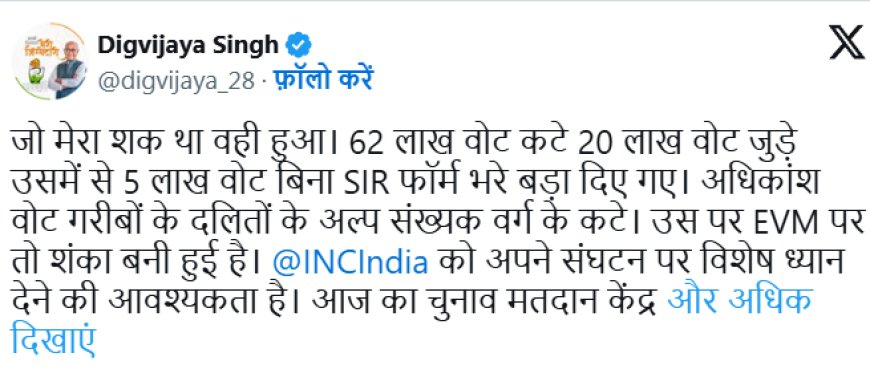 दिग्विजय ने कहा है, चुनाव के दौरान 62 लाख नाम मतदाता सूची से हटाए गए, जबकि 20 लाख नए नाम जोड़े गए। इनमें भी करीब 5 लाख वोट बिना SIR फॉर्म भरे जोड़े जाने का आरोप है। उन्होंने दावा किया कि हटाए गए वोटों में बड़ी संख्या गरीब, दलित और अल्पसंख्यक तबके के मतदाताओं की है। EVM पर संदेह बरकरार है। दिग्विजय ने कांग्रेस के जो उम्मीदवार जीते हैं उन्हें बधाई दी है।