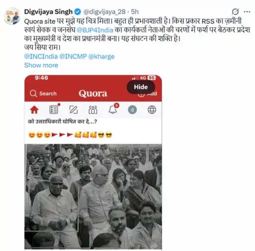 दिग्विजय सिंह द्वारा साझा की गई इस ब्लैक एंड व्हाइट तस्वीर में प्रधानमंत्री नरेंद्र मोदी, पूर्व उपप्रधानमंत्री लालकृष्ण आडवाणी के चरणों के पास फर्श पर बैठे दिखाई दे रहे हैं। तस्वीर को प्रभावशाली बताते हुए दिग्विजय सिंह ने लिखा कि उन्हें यह चित्र 'Quora' साइट पर मिला। उन्होंने पोस्ट में उल्लेख किया कि किस प्रकार आरएसएस का एक जमीनी स्वयंसेवक और जनसंघ/भाजपा का साधारण कार्यकर्ता, शीर्ष नेताओं के चरणों में बैठकर आगे बढ़ा और अंततः प्रदेश का मुख्यमंत्री व देश का प्रधानमंत्री बना। उन्होंने इसे 'संगठन की शक्ति' करार देते हुए अंत में 'जय सिया राम' भी लिखा।