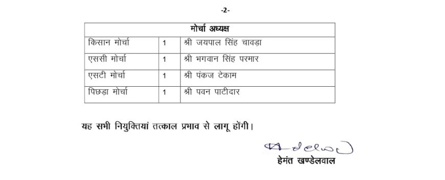 प्रमुख बदलावों में लता वानखेड़े, सुमेर सोलंकी, गौरव रणदिवे और राहुल कोठारी को प्रदेश महामंत्री बनाया गया है। मौजूदा मीडिया प्रभारी आशीष अग्रवाल को दोबारा मौका मिला है। रीवा संभाग के संगठन मंत्री रहे श्याम महाजन को प्रदेश कार्यालय मंत्री की जिम्मेदारी सौंपी गई है, जबकि अखिलेश जैन कोषाध्यक्ष बने हैं।