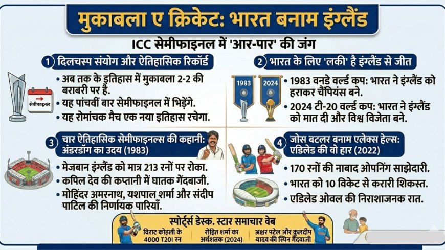भारत और इंग्लैंड ICC सेमीफाइनल में 5वीं बार भिड़ने को तैयार हैं। जानें 1983 से 2024 तक के सभी मुकाबलों का रोमांच, रिकॉर्ड्स और भारत की जीत का लकी फैक्टर