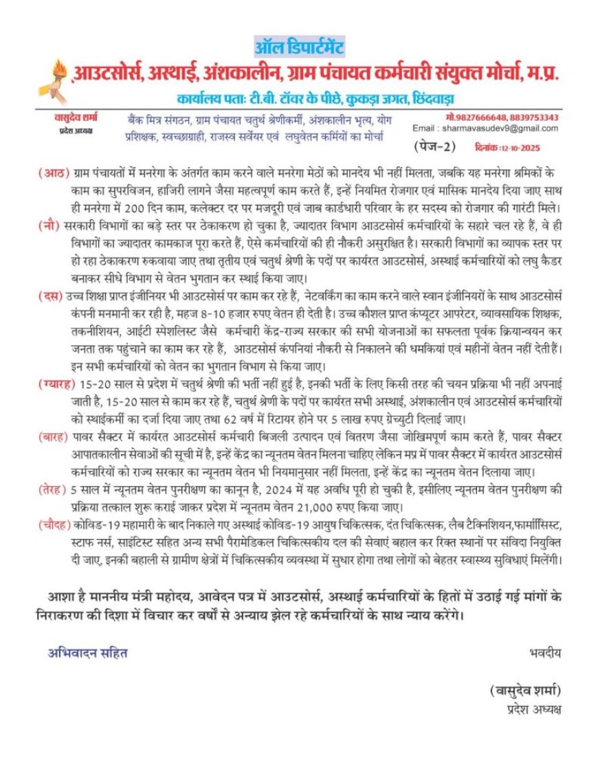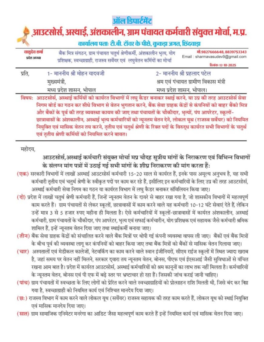 संगठन पदाधिकारियों ने इस बात पर जोर दिया कि मध्य प्रदेश में पिछले दो दशकों से तृतीय एवं चतुर्थ श्रेणी की नियमित भर्तियाँ लगभग बंद हैं, जबकि विभागीय कार्य इन्हीं आउटसोर्स और अस्थायी कर्मियों से कराए जा रहे हैं, जिन्हें न तो सम्मानजनक वेतन मिलता है और न ही भविष्य की सुरक्षा।