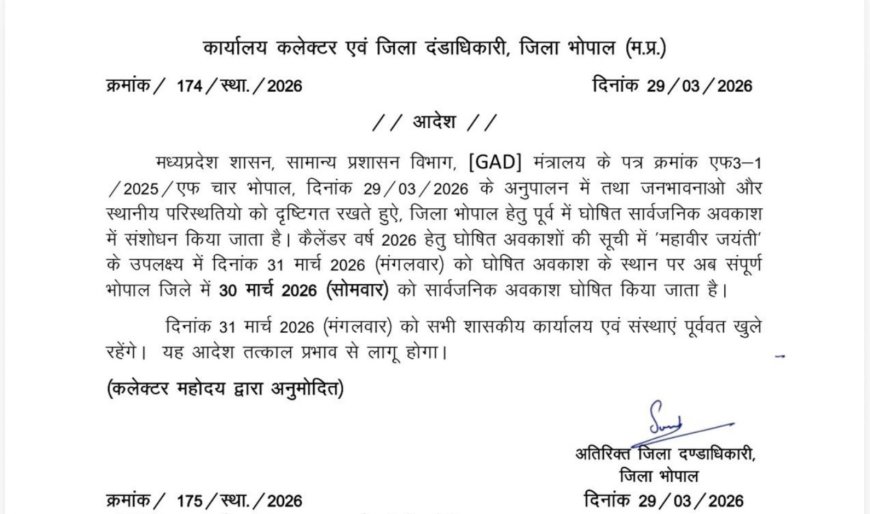 राजधानी भोपाल के संदर्भ में स्थिति स्पष्ट करते हुए जिला कलेक्टर कौशलेन्द्र विक्रम सिंह ने संशोधित आदेश जारी कर दिया है। भोपाल जिले में अब महावीर जयंती का सार्वजनिक अवकाश 30 मार्च 2026 को रहेगा। इस दिन जिले के सभी शासकीय कार्यालय और शिक्षण संस्थान बंद रहेंगे।