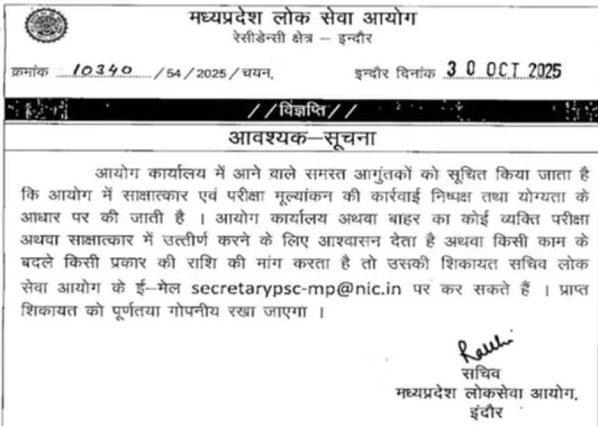 MPPSC ने साक्षात्कारों के बीच अभ्यर्थियों को धोखाधड़ी से बचाने के लिए आवश्यक सूचना जारी की है। भर्ती में पास कराने के नाम पर पैसे मांगने वालों की शिकायत secretary-mp@nic.in पर की जा सकती है, जिसे गोपनीय रखा जाएगा। NEYU ने पारदर्शिता की इस पहल का स्वागत किया है।
