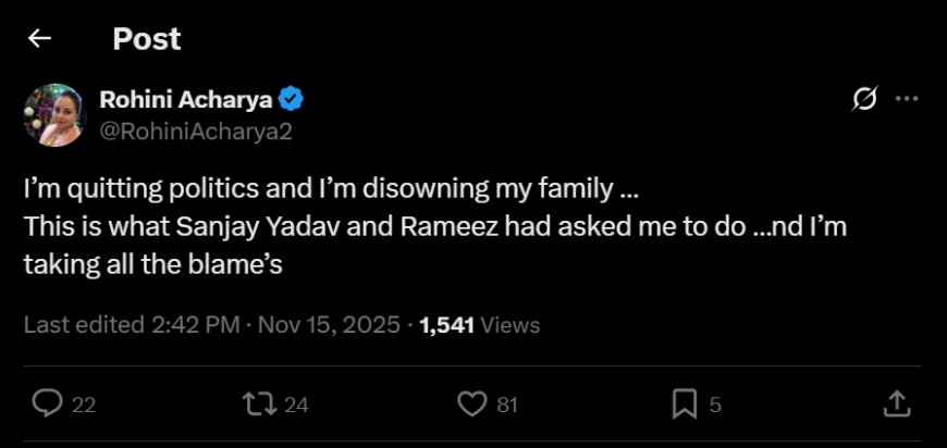 रोहिणी आचार्य ने लिखा, "मैं राजनीति छोड़ रही हूं और अपने परिवार से नाता तोड़ रही हूं। संजय यादव और रमीज ने मुझसे यही करने को कहा था और मैं सारा दोष अपने ऊपर ले रही हूं।"